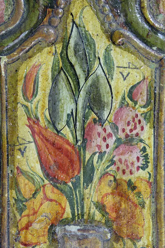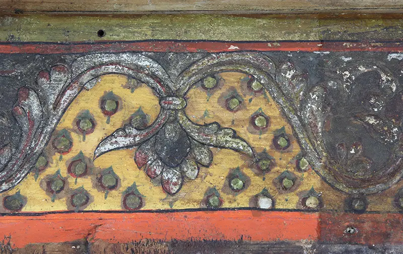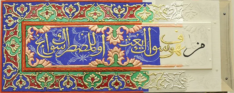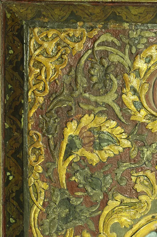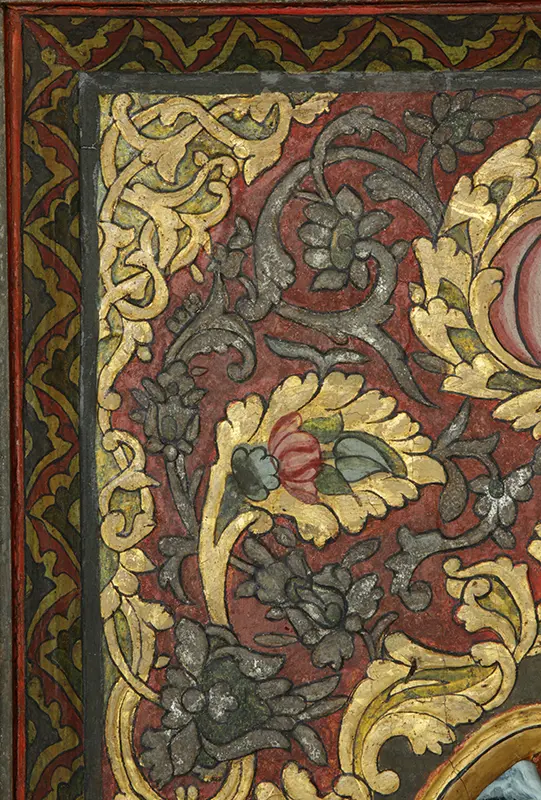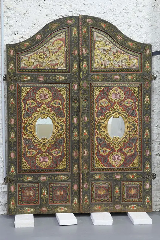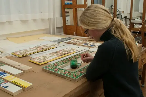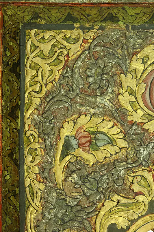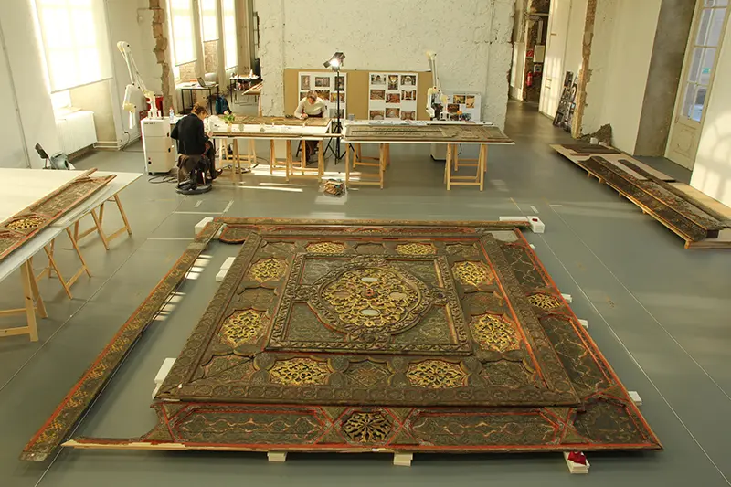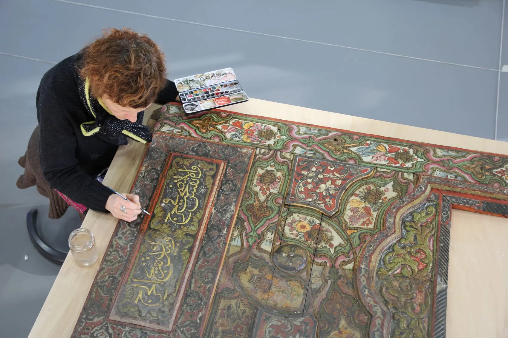 Die Restaurierung des Damaskuszimmers ist dank der großzügigen Unterstützung durch die Museum and Research Foundation weit fortgeschritten. Bereits seit Ende 2014 ist die Konservierung der gelockerten originalen Farbschichten auf den 110 Einzelteilen abgeschlossen und damit ein wichtiger Schritt zur Bewahrung des Zimmers für die Zukunft geschafft. Seither durchlaufen die kunstvoll verzierten Holzpaneele eine Reihe von Restaurierungsmaßnahmen, die von Bauteil zu Bauteil, aber auch von Farbfläche zu Farbfläche immer wieder neu abgestimmt werden müssen, weil die unterschiedlichen Farben; Metallauflagen und gefärbten Lacküberzüge in ihrem Erhaltungszustand stark schwanken. Die Gründe dafür liegen zum einen darin, dass die Materialien bei der Herstellung des Zimmers wiederkehrend frisch von Hand zubereitet wurden. Dadurch schwankt die Zusammensetzung der Farben und führte im Zusammenspiel mit den Alterungsprozessen dazu, dass manche Farbschichten noch recht stabil sind, andere jedoch äußerst empfindlich reagieren. Zum anderen variiert der Beschädigungsgrad der Holzpaneele durch die unterschiedlich starke Beanspruchung während der 90 Jahre, in denen das Zimmer als Wohnraum in Damaskus genutzt wurde. Die untere Wandzone bis zu einer Höhe von etwa 1 m ist stärker abgenutzt als die oberen Wandbereiche und die Decke. Ein Übriges taten Klimaschwankungen und durch die Decke eindringendes Wasser, als das Zimmer noch in Damaskus eingebaut war. Nicht zuletzt stellten die Restauratoren fest, dass insbesondere die karminroten Lackflächen auf den Zinnfolieauflagen bereits 1899 stark beschädigt und abgeplatzt waren. Für den Verkauf nach Deutschland wurden diese Flächen übermalt. Nach der Abnahme der Übermalungen, Leim- und Firnisschichten zeigen sich viele Paneele in erstaunlich gutem Zustand und haben nur vereinzelte weiße Fehlstellen, die farblich angepasst werden müssen. Einige der besonders aufwändig verzierten Bauteile, wie die Wandschranktüren und Schmuckpaneele, weisen die beschriebenen stärkeren Beschädigungen aus der Zeit in Damaskus auf. Diese Flächen erfordern einen größeren Retuscheumfang. Die vielen feinen Ausbrüche und Fehlstellen werden wieder mit den entsprechenden Farben ausgefüllt. Dabei werden die unterbrochenen Umrisslinien aufs Neue miteinander verbunden, damit die üppigen Ornamente ihren einstigen optischen Zusammenhalt zurückerhalten: Feinste Details sind wichtig und spielen im Kanon der Farben, Linien und Texturen eine bedeutende Rolle, um dem Zimmer als Gesamtkunstwerk seine beabsichtigte Wirkung zurückzugeben.